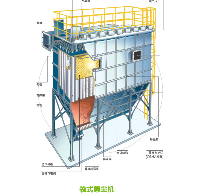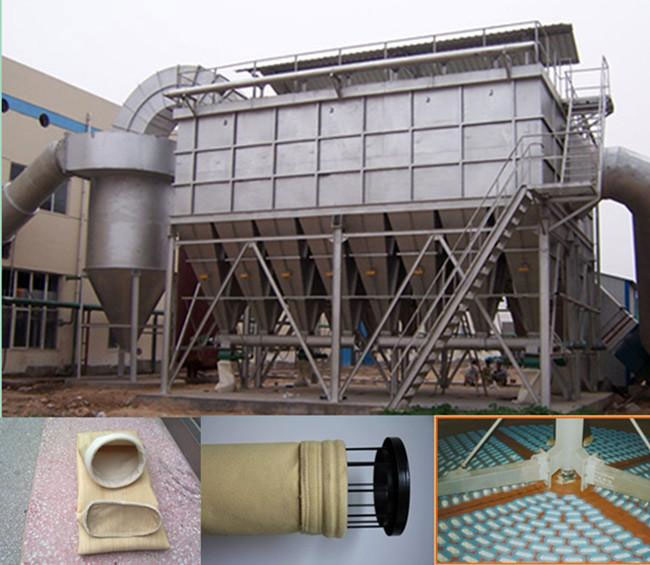 含尘废气经由进气导流装置平均分布后进入集尘机,导流板的实际位置取决于粉尘种类机浓度,本装置会促使比重大的尘粒直接落入排灰斗,而比重小的颗粒上扬均匀分布于集尘机内;含尘废气穿过滤袋时颗粒物付着于滤袋表面,经过滤后的洁净气体上扬排出,尘粒经高压脉冲系统定时清洗后,持续将粉尘掉落于排尘斗后排出。