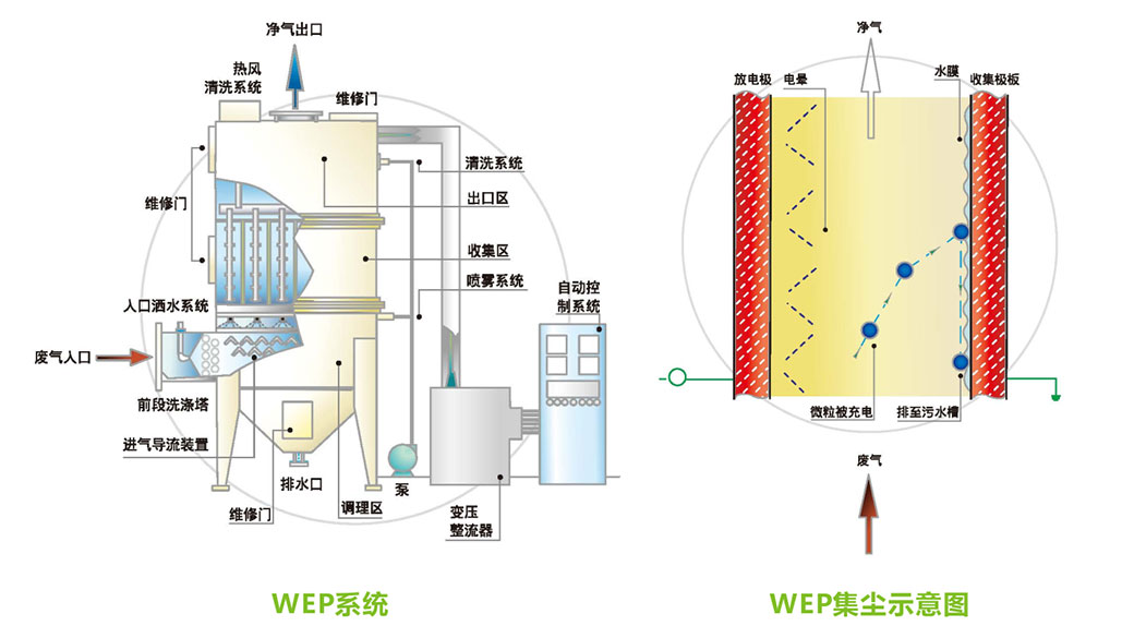 含尘废气或酸雾气进入静电集尘机后向上流经释放高电压直流负电的尖端放电极群组产生的电晕环境种,造成废气中的颗粒物质携带负电,基于物理特性,带负电颗粒物横向漂移至带正电的接地收集板上,经由定时喷水清洗润湿的极板表面,将普及的粒状物质向下流排至集尘机底部污水收集槽后排放。
