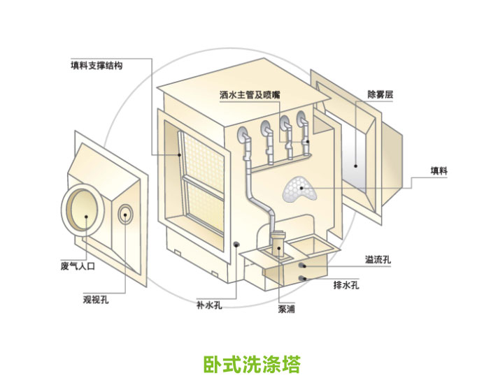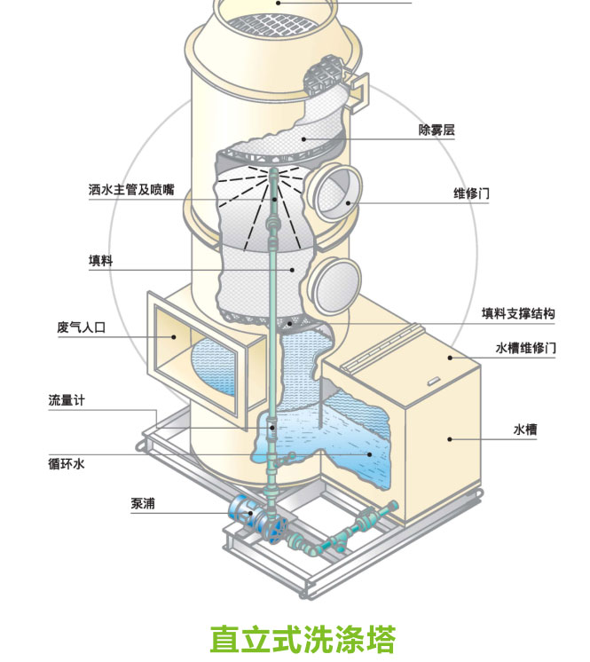 填充床式洗涤塔处理原理是在循环水中注入药液,并于洗涤塔内喷洒至酸/碱气体中,将酸/碱气体中的物质中和洗涤,并溶于循环水中,循环水排入排入水槽中再经循环泵打入洗涤塔内,循环持续中和的过程;当循环水导电度升高到一定程度,表示循环水溶入太多污染物,需经系统进行更换并重新调整循环水的药液用量,以持续进行废气处理。