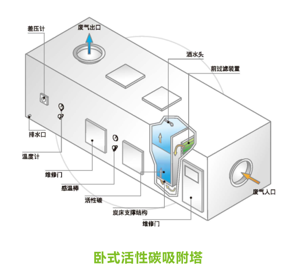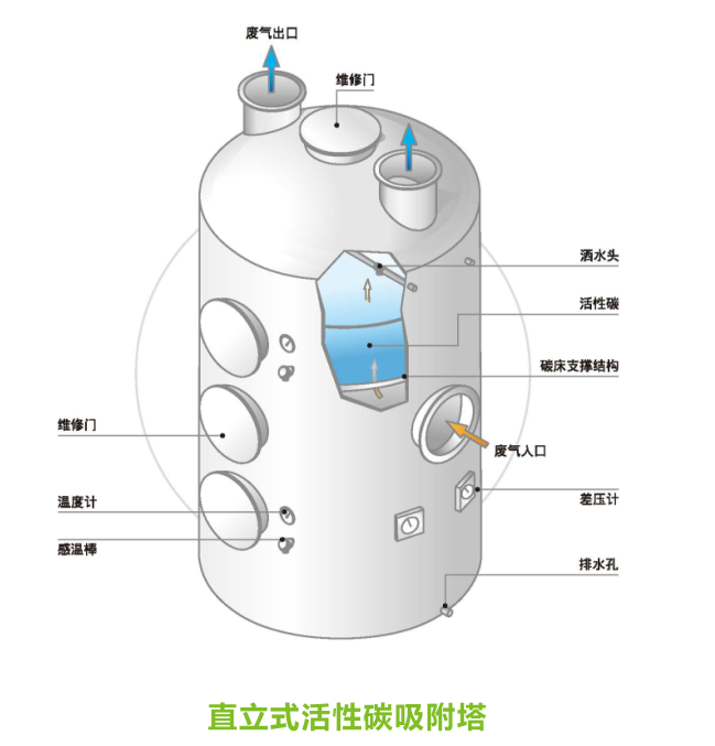 活性炭吸附塔中被吸附为废气中待处理的污染物,进行吸附作用的称为吸附剂(如活性碳),废气中所含的污染物经过吸附塔时黏附于吸附剂的表面以达到吸附及废气处理的效果,吸附原理可以用于空气净化及溶剂回收。活性炭吸附塔可以分为单床式和双床式吸附塔,可以处理臭气,挥发性有机物,酸碱及废水处理,油类精炼,造纸等过程产生的废气。